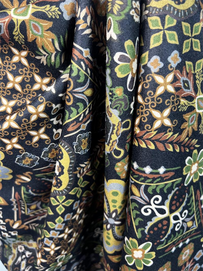 This exquisite woolen fabric blends rich colors with delicate printing techniques to showcase a complex ethnic-style pattern. The deep black background contrasts with tones of gold, olive green, caramel brown, and creamy white, creating a classical and luxurious atmosphere. The print incorporates various traditional elements such as symmetrical geometric shapes, intricate borders, and vivid botanical motifs, with each detail meticulously designed to imbue the fabric with a rich sense of history and artistic value.