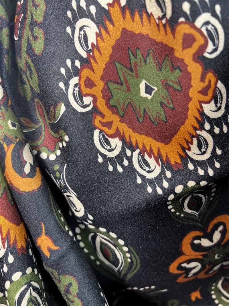 This woolen fabric is characterized by its deep and unique printed patterns, showcasing rich ethnic style and exquisite craftsmanship. The fabric is based on a deep black background, embellished with patterns in colors such as orange, grass green, brown, and white. These patterns are rooted in traditional geometric shapes and botanical elements, infused with a modern design sense, creating a distinctive visual effect.