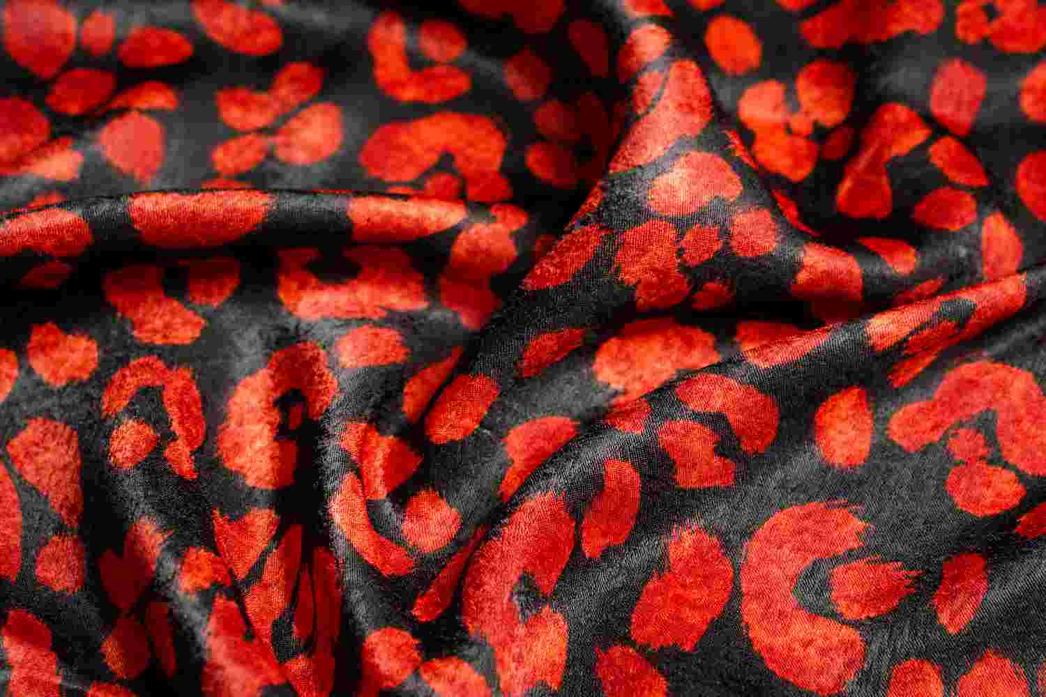 This print design is created on a velvet-touch dull satin fabric, featuring a leopard print pattern from the animal print category. The dominant color used in this design is vibrant red, creating a stunning and eye-catching product.