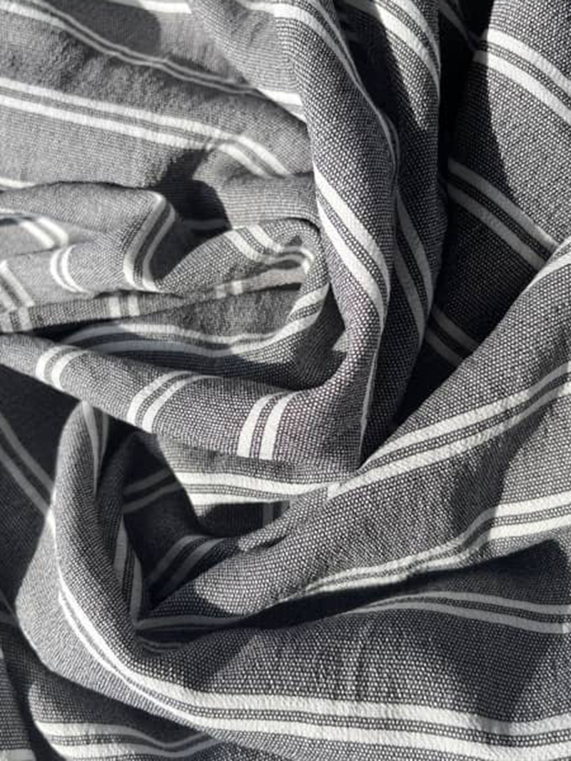 In the pursuit of resonating with nature in design, the bark crepe fabric has achieved a distinctive and innovative exploration of fashion. Its unique texture and feel add a different charm to the black and white textured stripe print. This delicate and natural fabric seems to be part of nature itself, with its subtle texture outlining the traces of time, perfectly presenting tranquility and purity. The black and white stripes bloom elegantly on the bark crepe, complementing each other and weaving a wonderful fusion of fashion and texture. The emphasis on the details of the print, with each stripe being a poetic tribute to the beauty of nature, allows you to perceive the vitality and profound tranquility of nature. This is not just a piece of clothing but also a tribute to the beauty of nature, allowing you to find inner peace and purity in the bustling world.