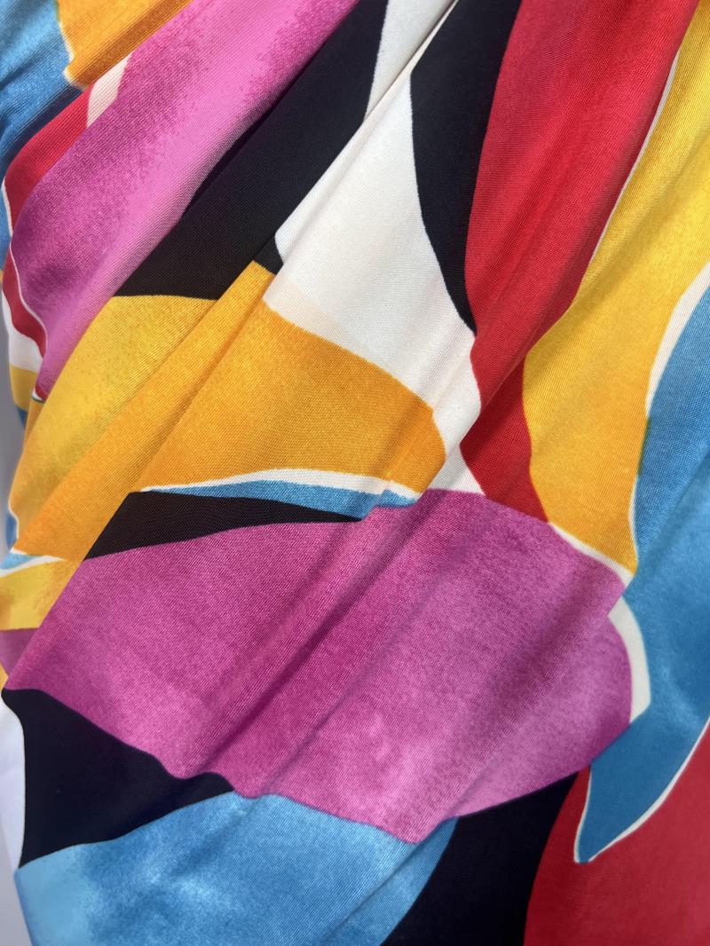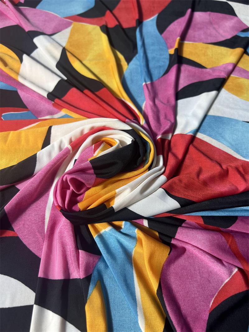 This is a polyester filament product full of artistic atmosphere, with a unique watercolor leaf geometric print design and a brilliant color combination. Red, light blue, and yellow intertwine to create a soft and layered transition effect, punctuated by a lively and vibrant visual impression. The design emphasizes the details and artistic nature of the print, creating an abstract and unique aesthetic. Wearing this polyester filament product will undoubtedly make you feel the natural and artistic atmosphere, showcasing the perfect fusion of fashion and art.